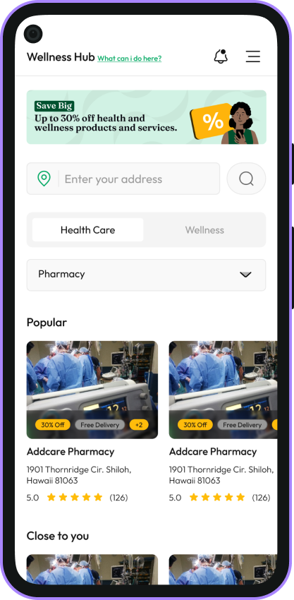 Introducing Your One-Stop Shop For All Your Health And Wellness Needs. Find everything from gyms to spas, hospitals to mental health centers near you with exclusive discounts up to 30% and easy payments with your Health Savings Account (HSA).